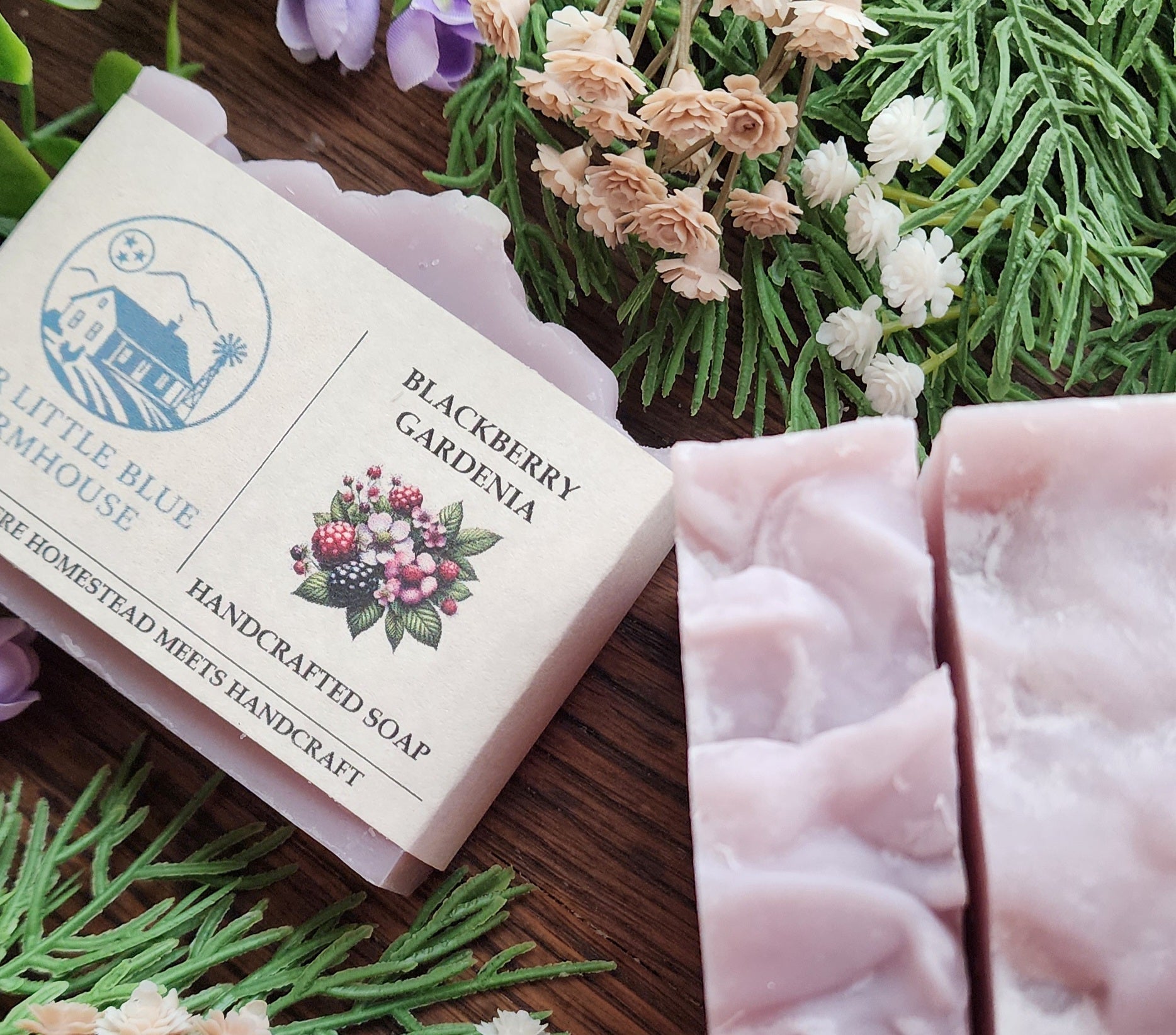 Handmade soap made right here at our little blue farmhouse! Our soaps are made using goat's milk for an extra creamy bar of soap! Coconut oil, olive oil and castor oil leave your skin feeling soft and conditioned. We use a combination of essential oils and fragrance oils from reputable soap making supply companies for unique and fun scents!