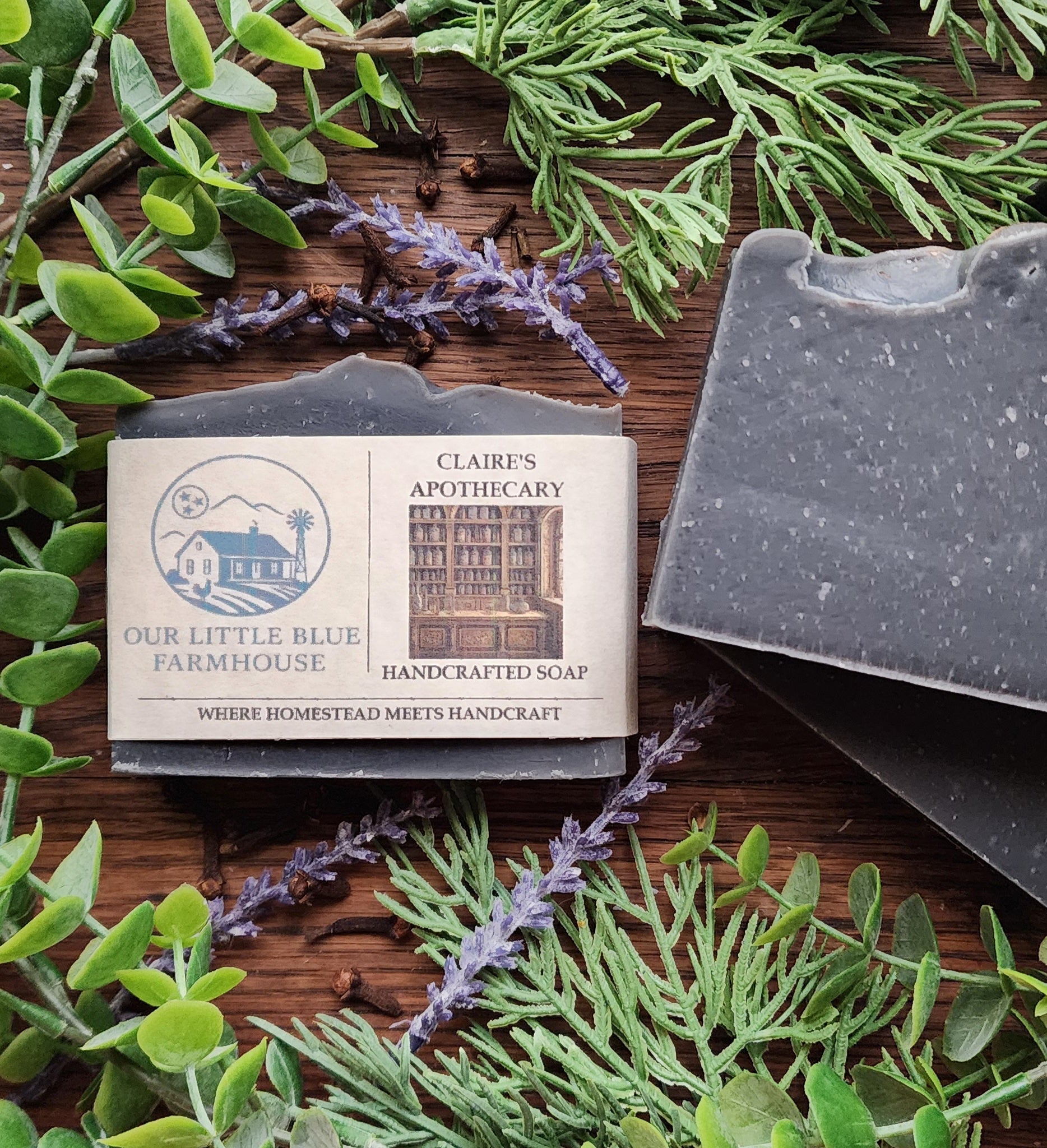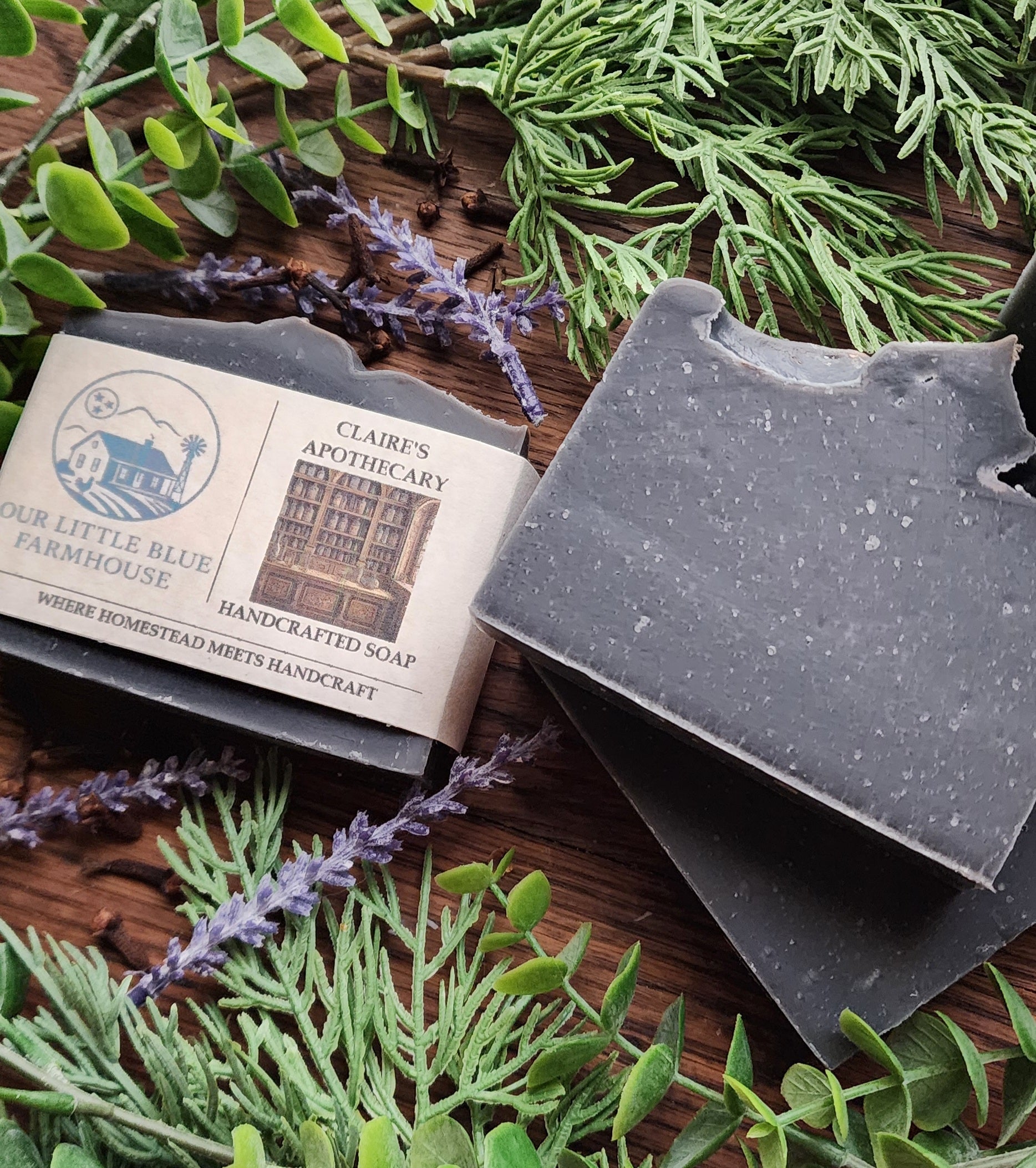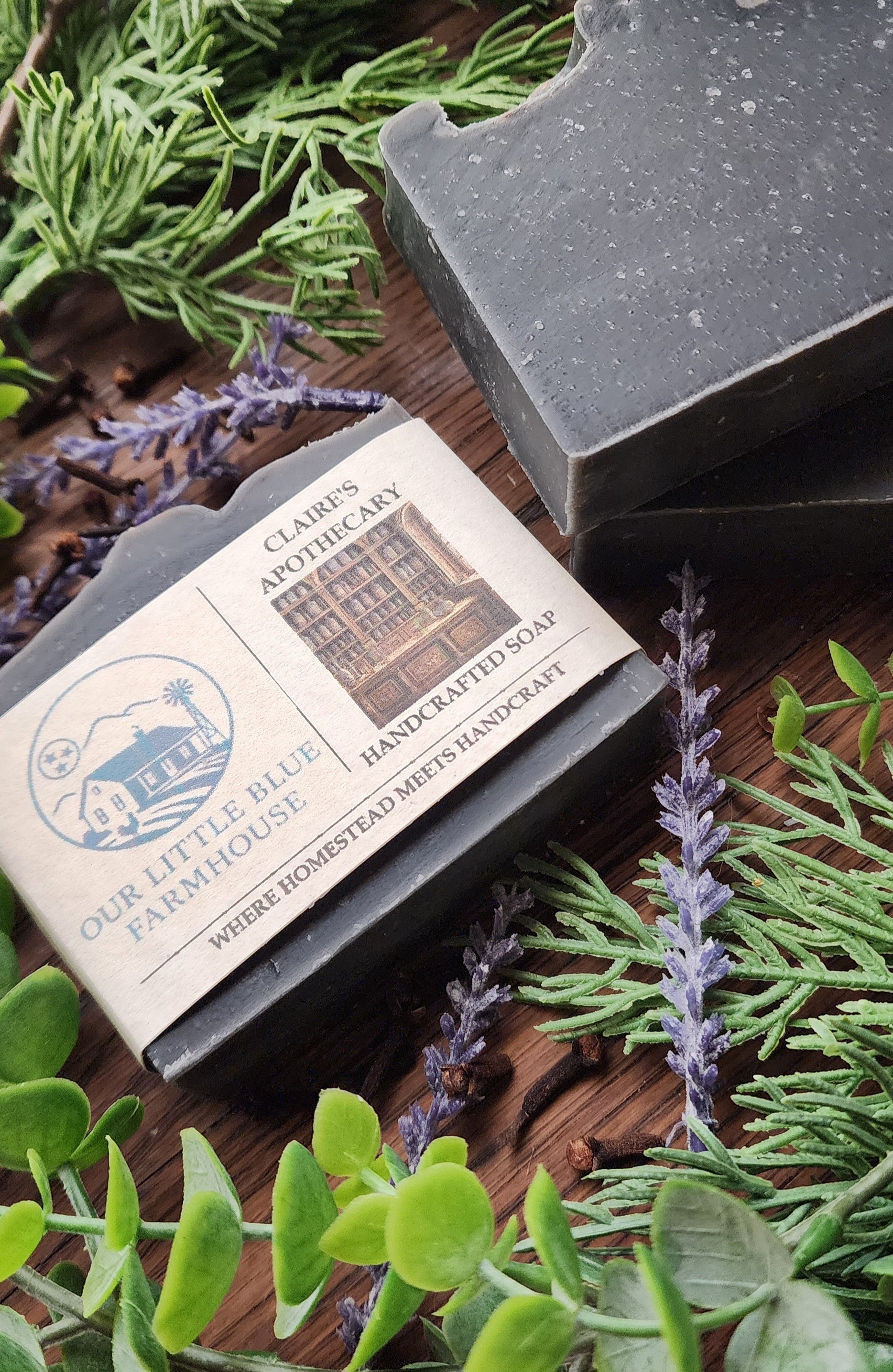 Claire's Apothecary - where are my Outlander fans?! This scent was Outlander inspired and has a sweet tonka and smoked vanilla scent. It is a complex scent including tonka, vanilla, patchouli, clove, black pepper, lavender, cedar, and bergamot. This soap has activated charcoal making it a great facial bar for drawing out dirt and oil.