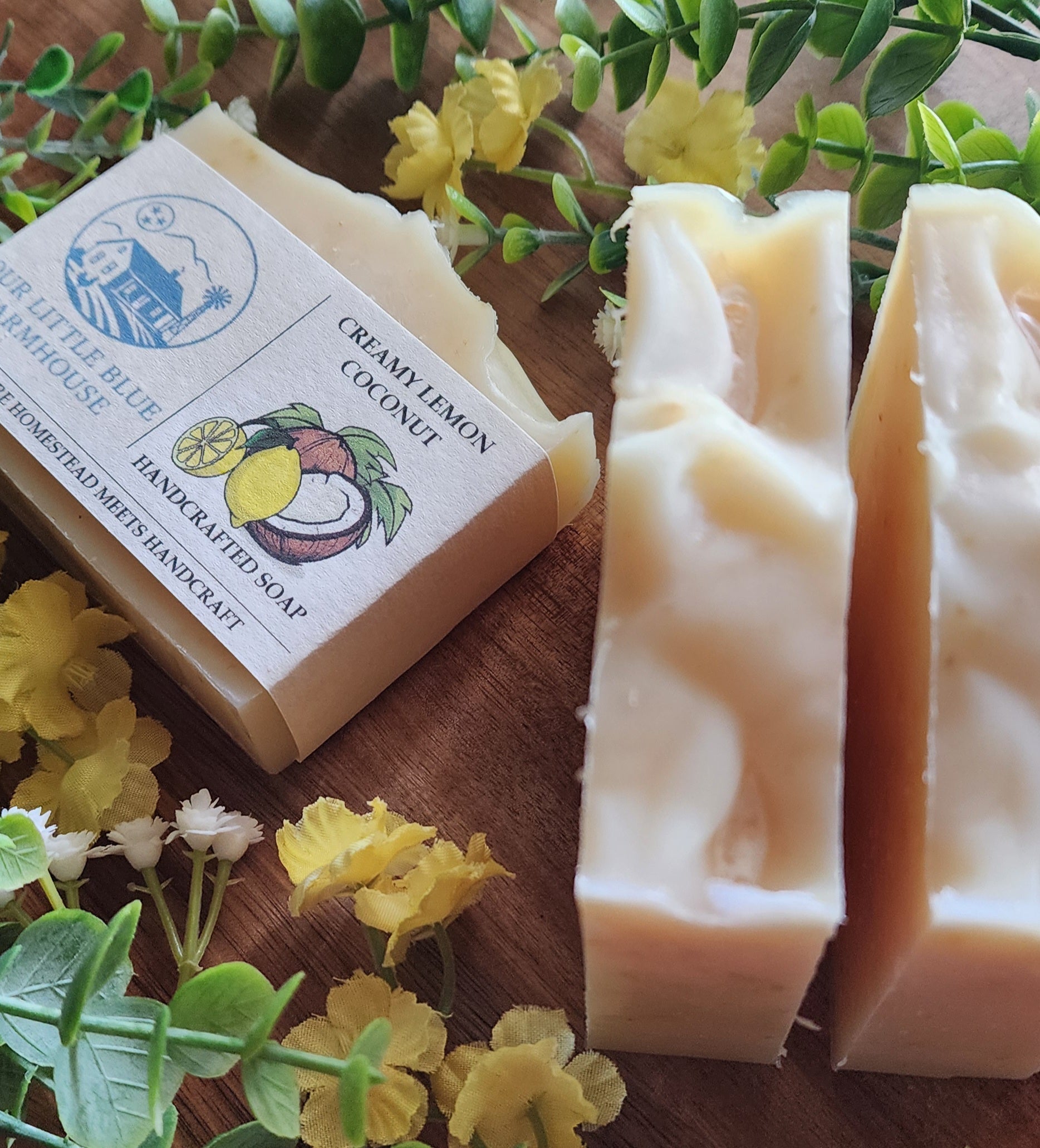 Creamy Lemon Coconut - this fresh citrus soap is scented with only lemon pure essential oil and dried lemon zest. Soap is made with coconut milk but does not smell like coconut.