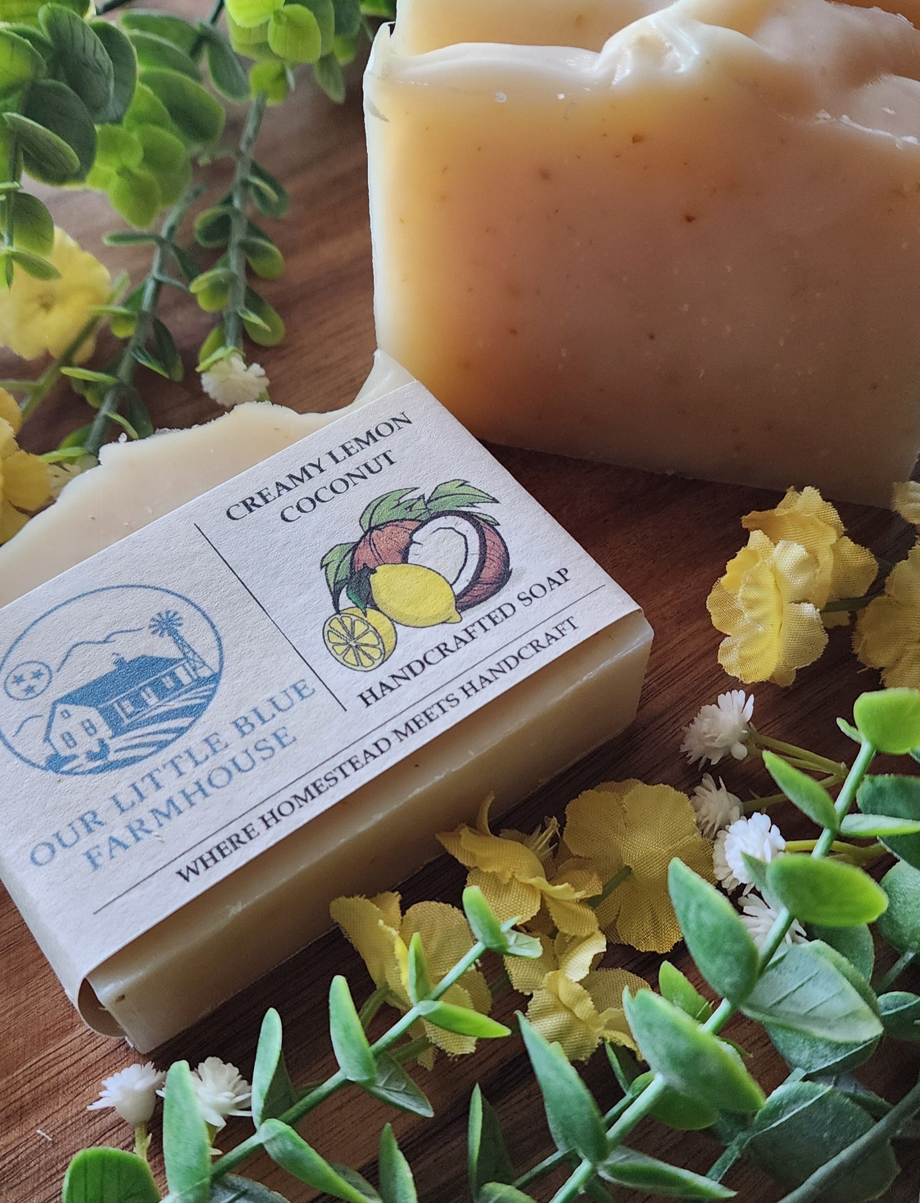 Handmade soap made right here at our little blue farmhouse! This soap is made using coconut milk for a non dairy bar of soap! Coconut oil, olive oil and castor oil leave your skin feeling soft and conditioned. We use a combination of essential oils and fragrance oils from reputable soap making supply companies for unique and fun scents!