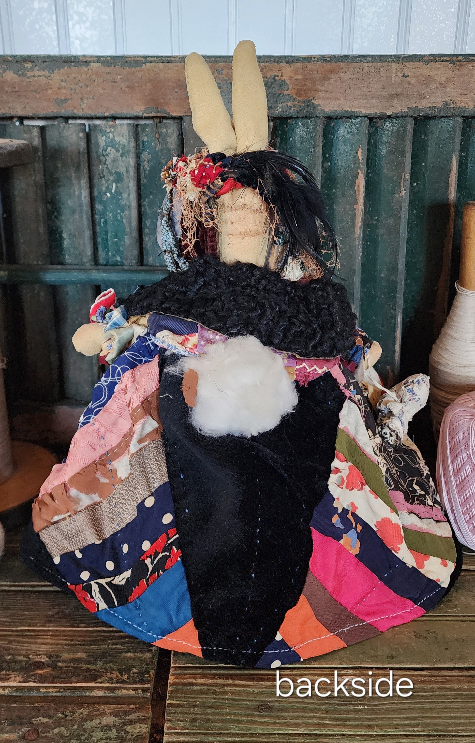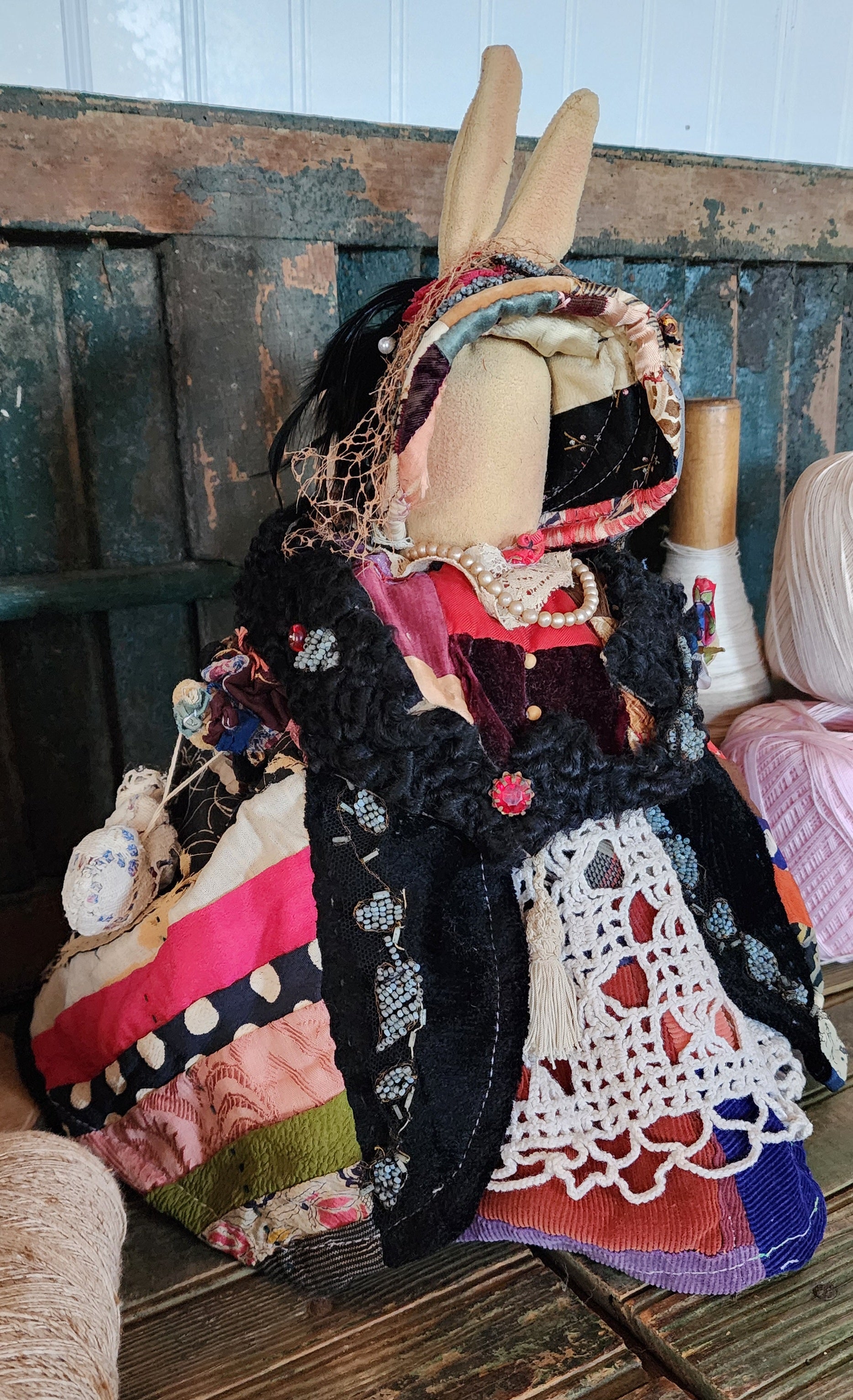 This particular bunny measures approximately 16 inches tall and is made up of layers of vintage linens. Underneath her skirts you can find a thread cone base for standing her up to display.