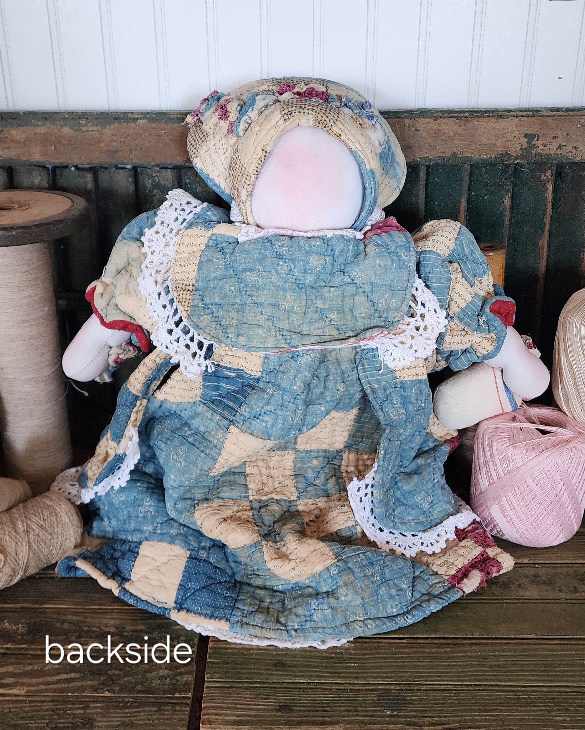 She has been making these dolls for 40+ years using quilts, fabrics, linens, embroidery, and textiles from the past. She uses worn and forgotten about materials and gives them a new life. No good quilts were destroyed simply to make these. The dolls have no faces because the idea is to focus on all the wonderful quilts and linens that have been reinvented in her dolls. Each doll is signed by her(as shown in photos). All linens have been washed before being made into dolls.
