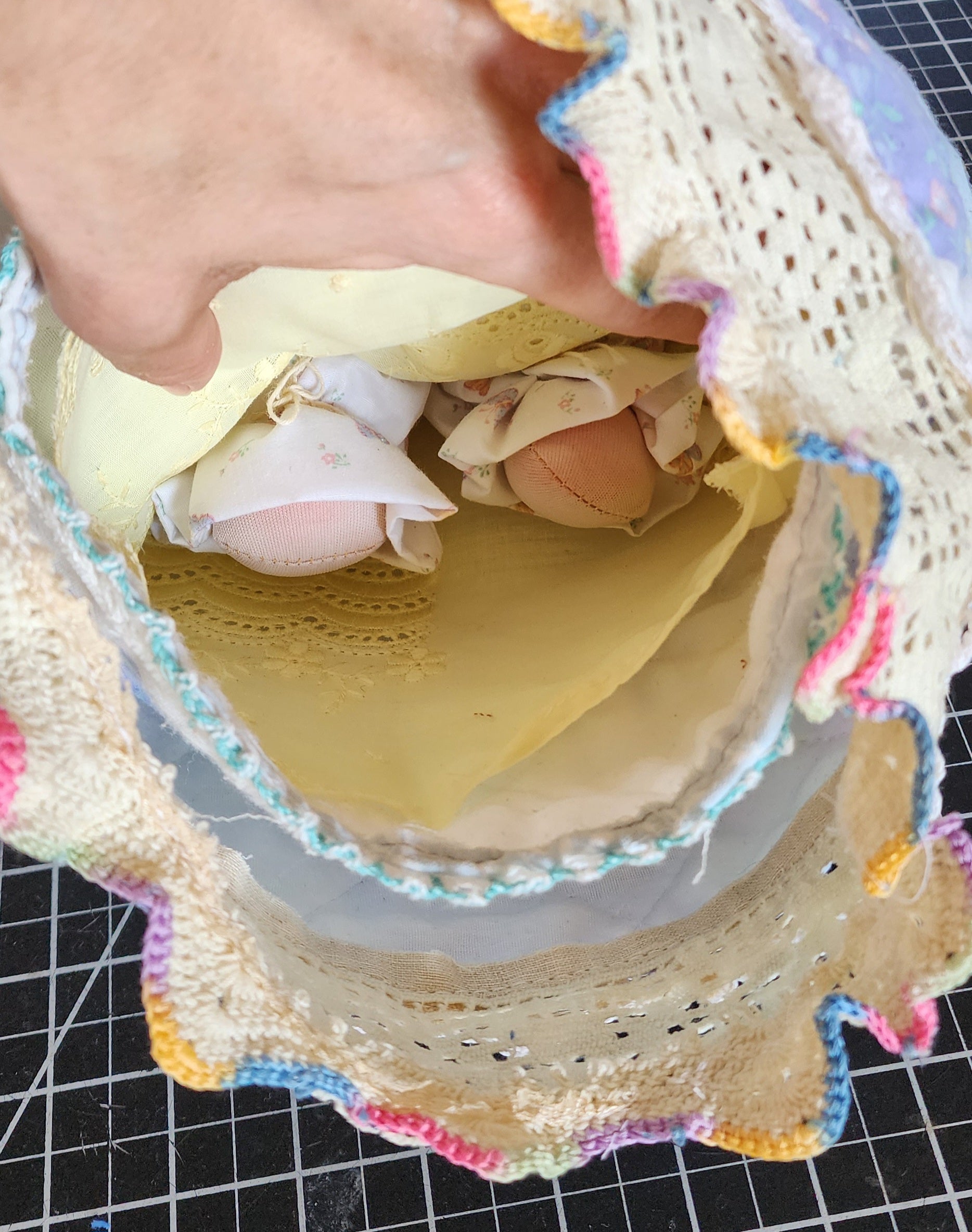 This doll was lovingly handmade by my husband's grandmother from vintage quilt and linen remnants. Her crafts are truly one of a kind with none of them being just alike. She is the inspiration behind my work with vintage linens as well. She gave me my first sewing machine and talked me through my first few stitches on it.