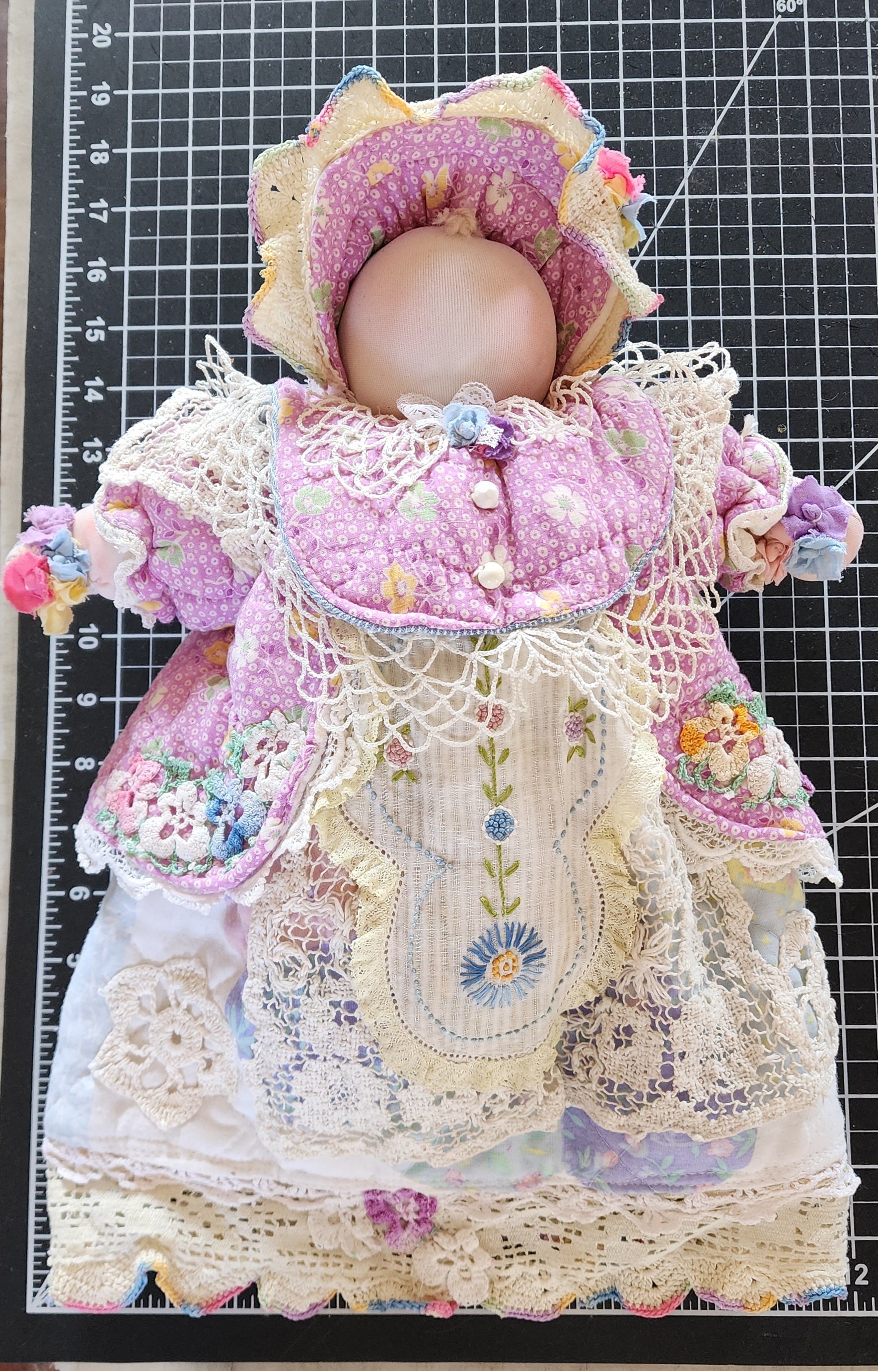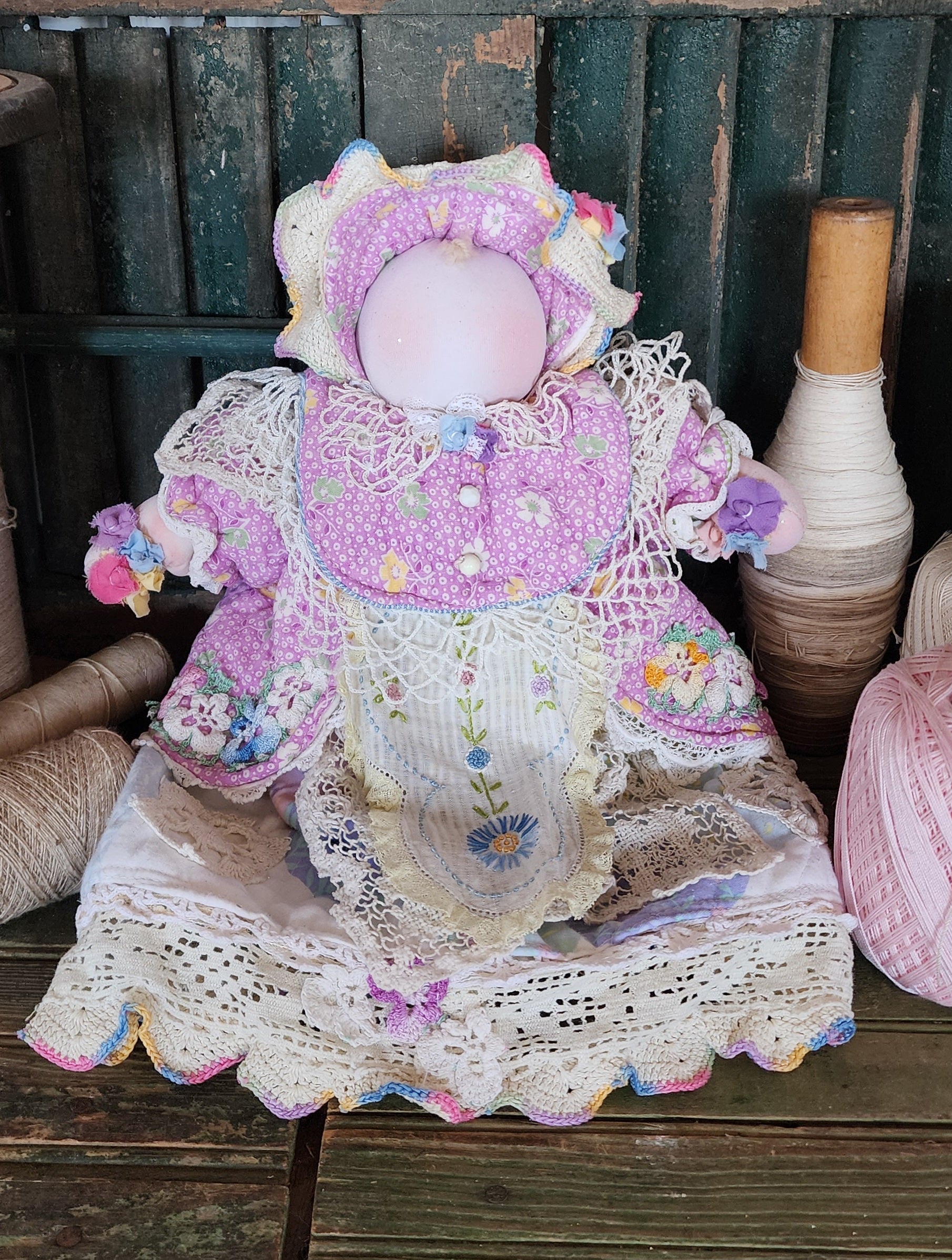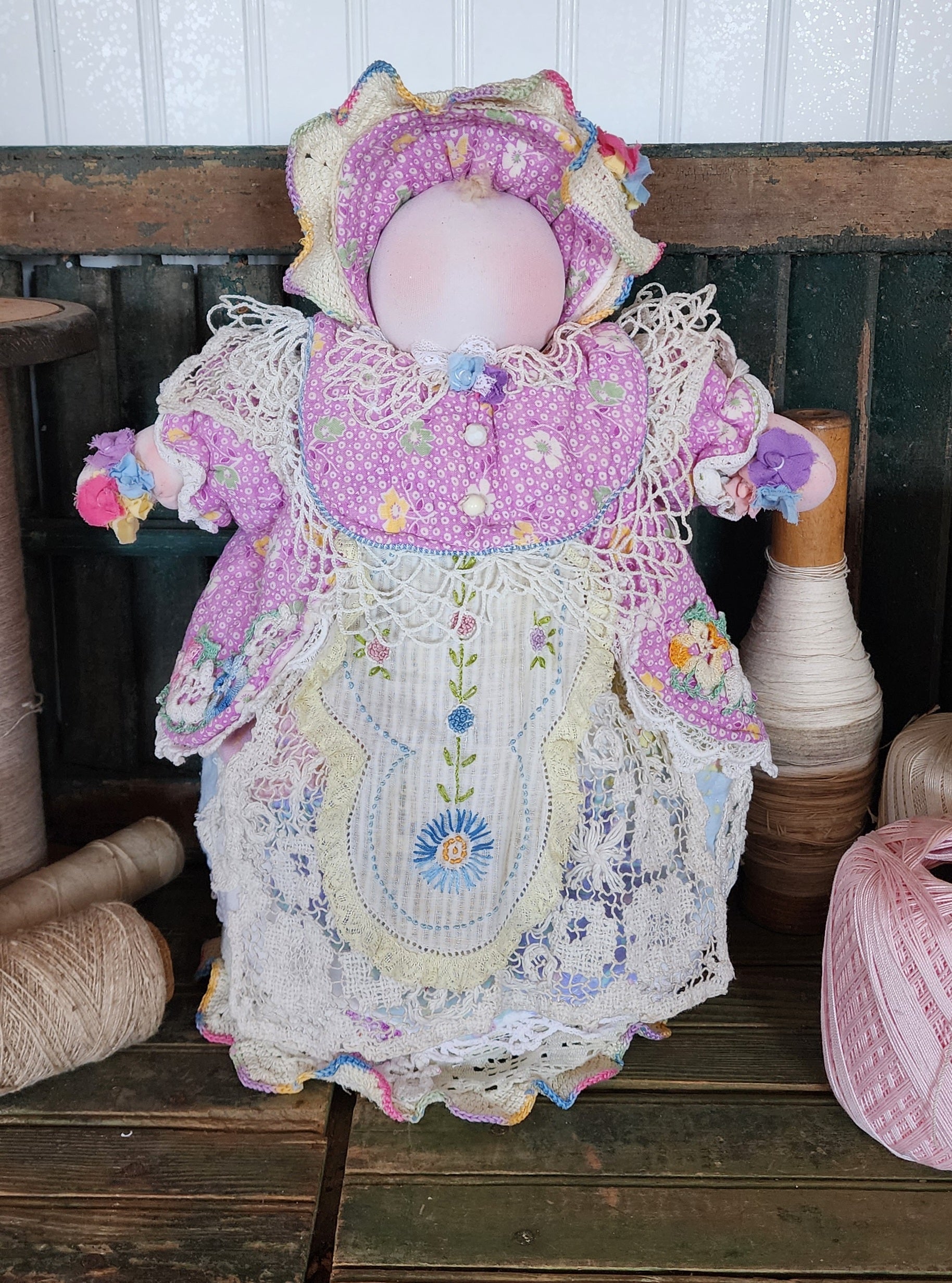 She has been making these dolls for 40+ years using quilts, fabrics, linens, embroidery, and textiles from the past. She uses worn and forgotten about materials and gives them a new life. No good quilts were destroyed simply to make these. The dolls have no faces because the idea is to focus on all the wonderful quilts and linens that have been reinvented in her dolls. Each doll is signed by her(as shown in photos). All linens have been washed before being made into dolls.