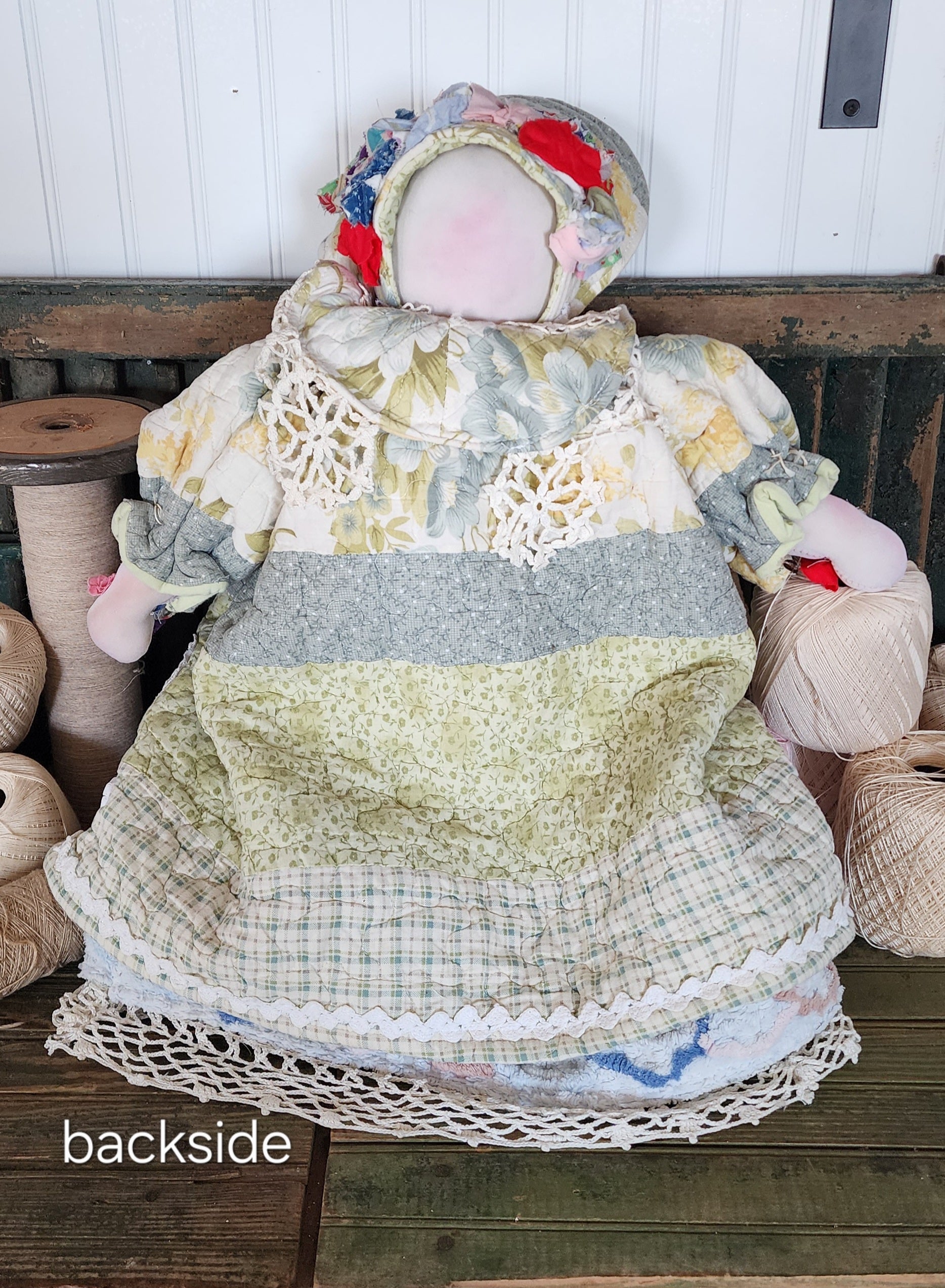 She has been making these dolls for 40+ years using quilts, fabrics, linens, embroidery, and textiles from the past. She uses worn and forgotten about materials and gives them a new life. No good quilts were destroyed simply to make these. The dolls have no faces because the idea is to focus on all the wonderful quilts and linens that have been reinvented in her dolls. Each doll is signed by her(as shown in photos). All linens have been washed before being made into dolls.