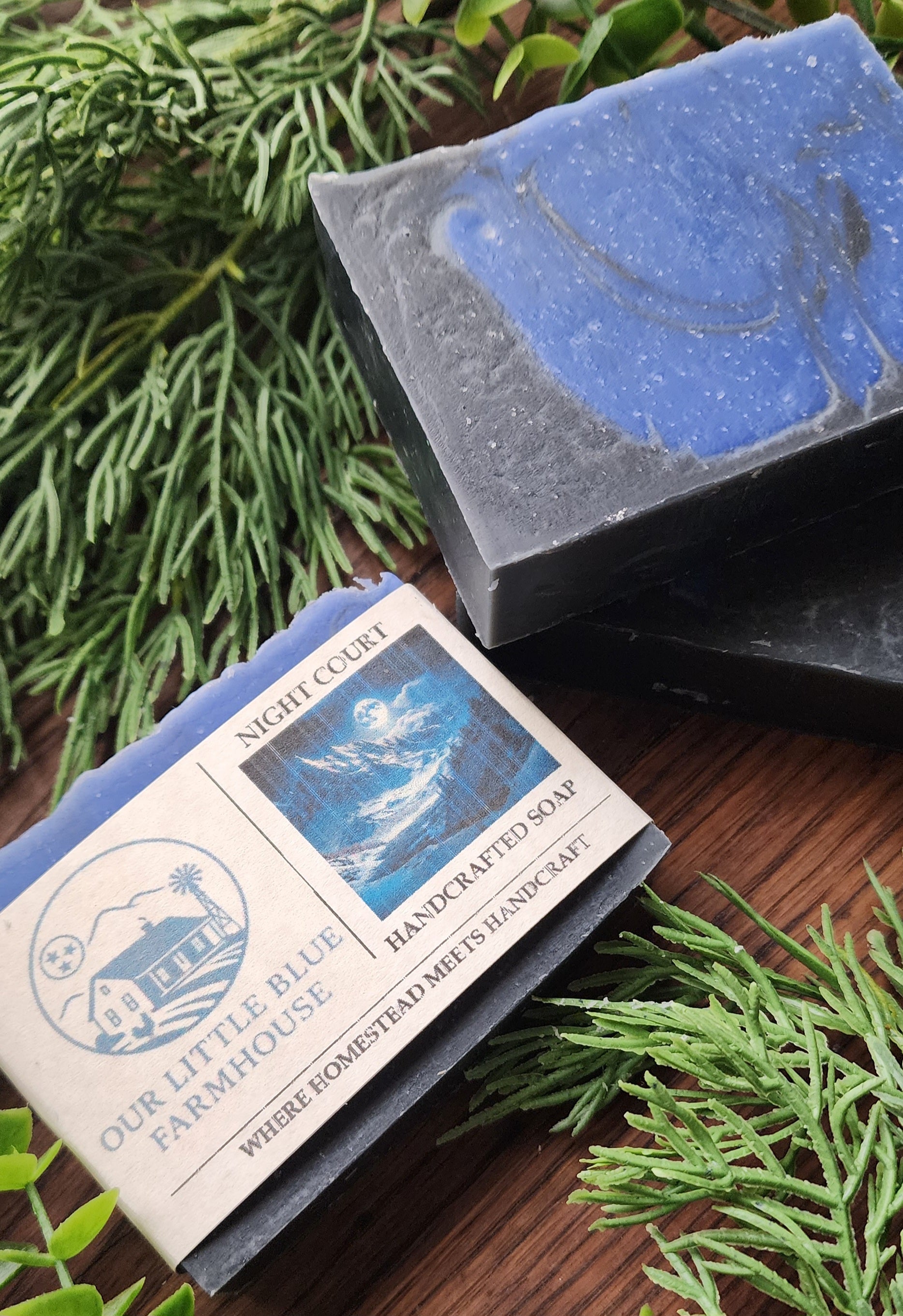 Night Court - inspired by A Court of Thorns and Roses book series, this soap represents Rhysand's Night Court - a sophisticated blend of mountain air and woodsy forest combined with soft florals and vanilla. This soap has a top layer of activated charcoal making it a great facial bar!