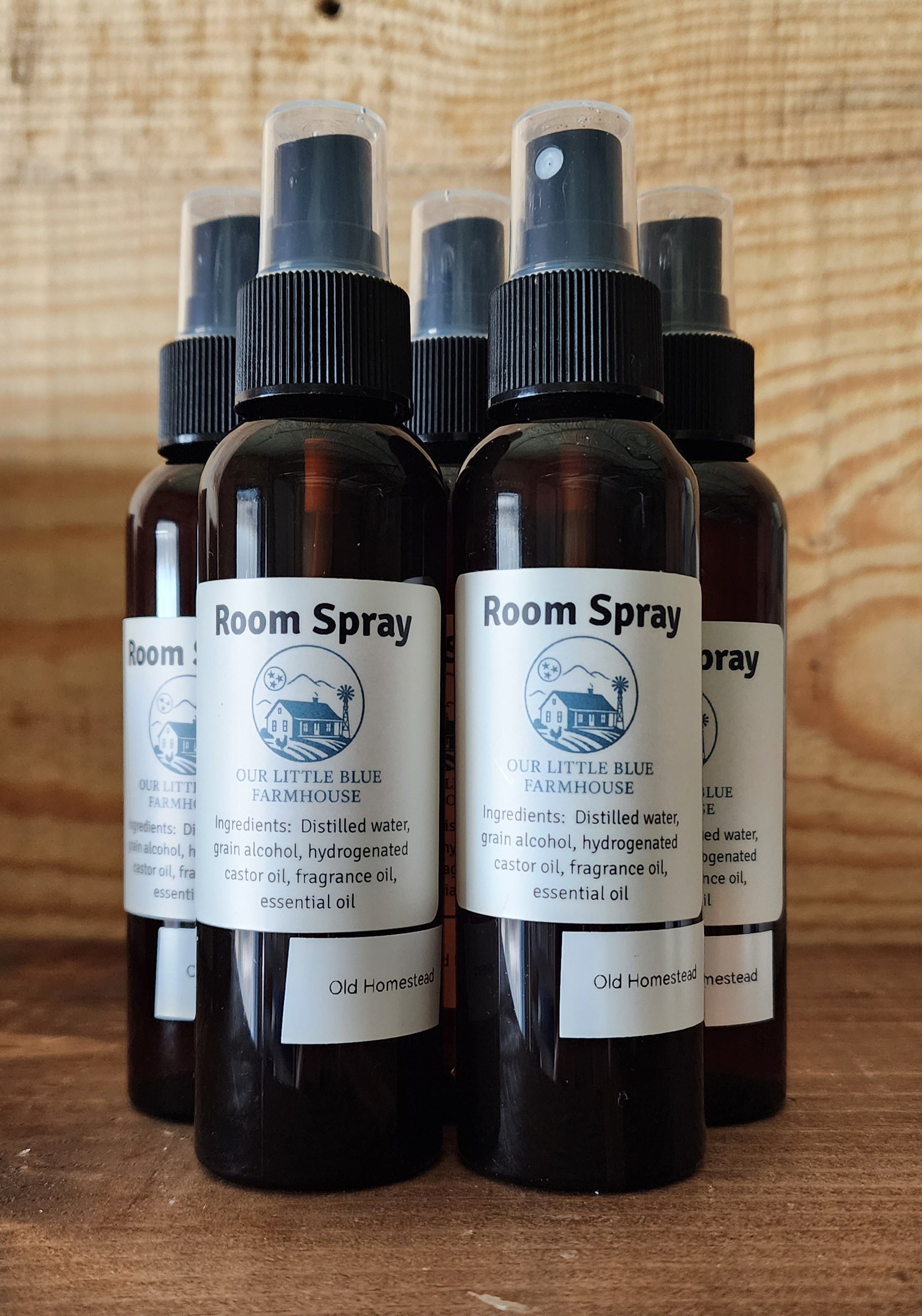 Room Spray ingredients: distilled water, grain alcohol, hydrogenated castor oil, fragrance oil, essential oil.