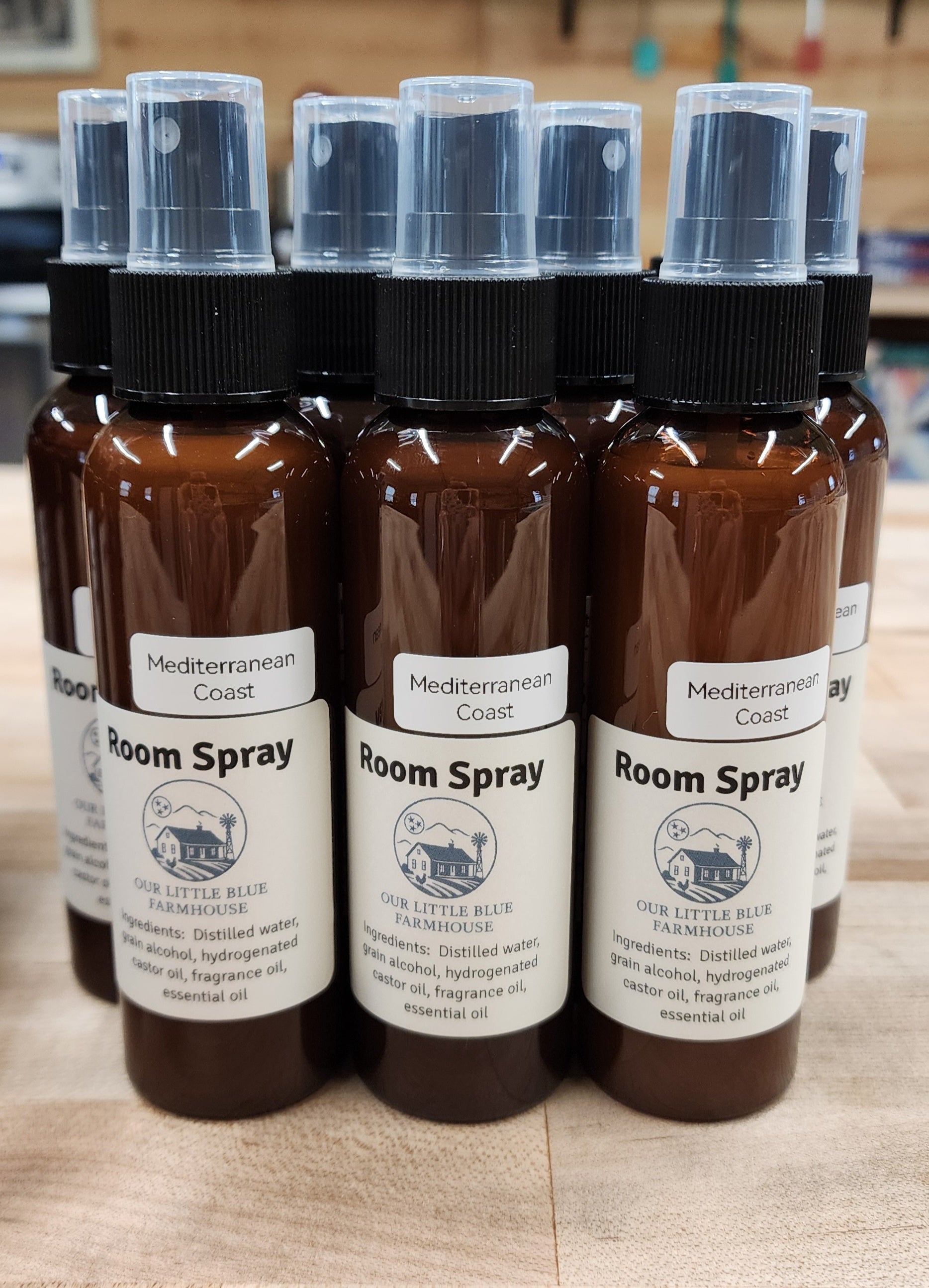 Room Spray ingredients: distilled water, grain alcohol, hydrogenated castor oil, fragrance oil.