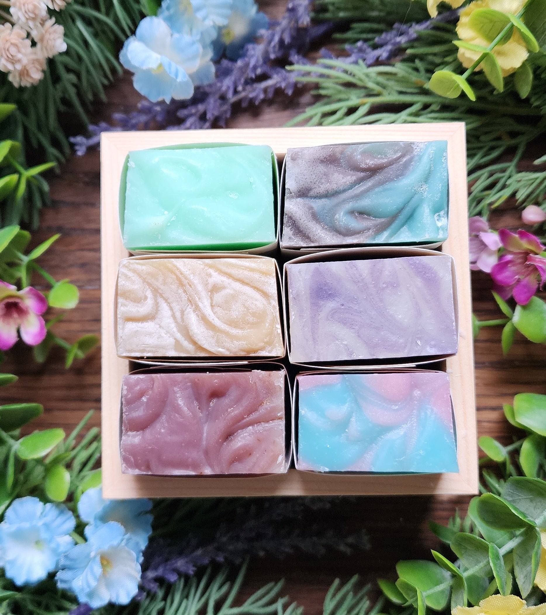 Soap Sample Box Collection includes 6 approximately 2 oz size bars of soap in the following scents: