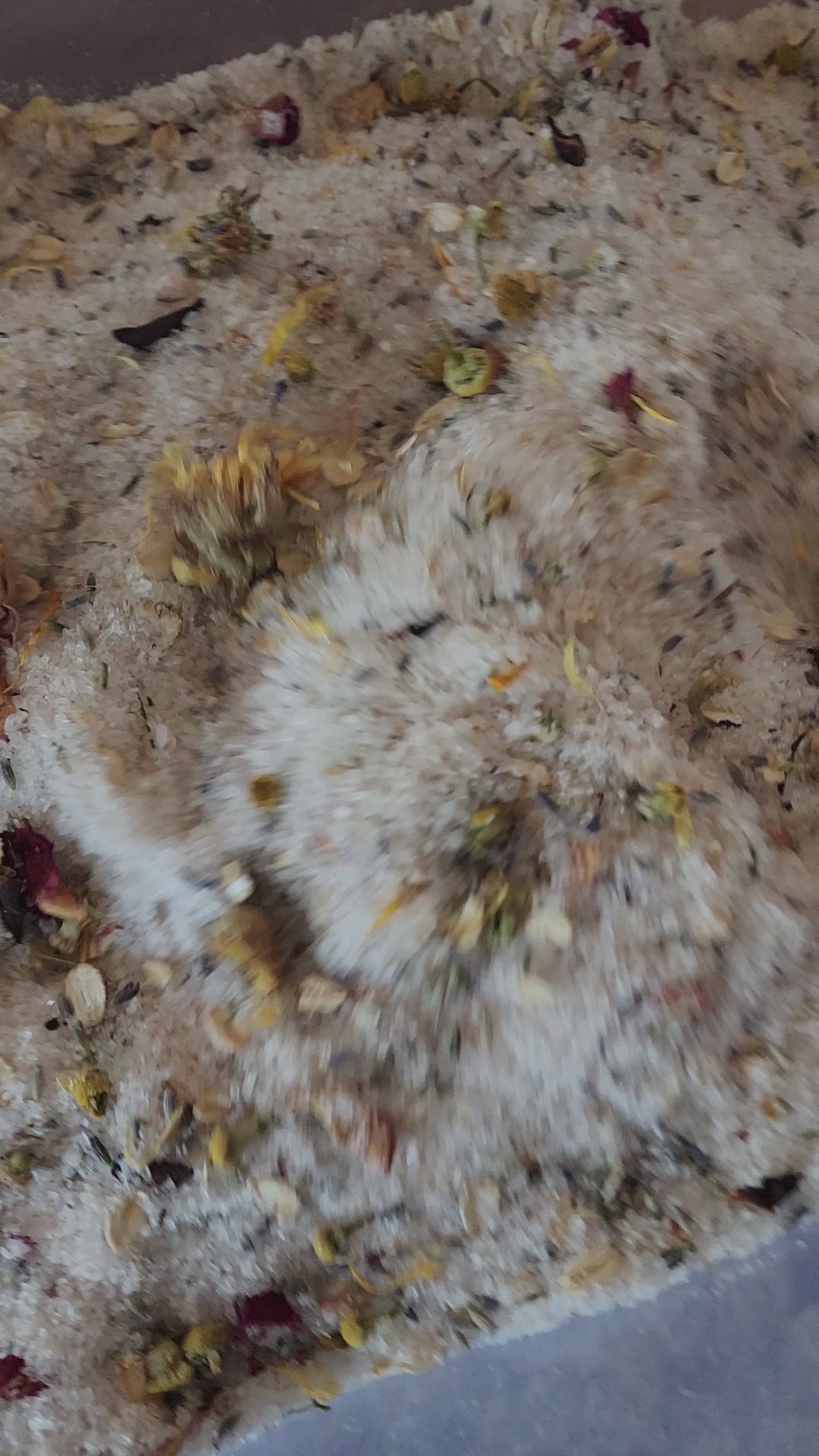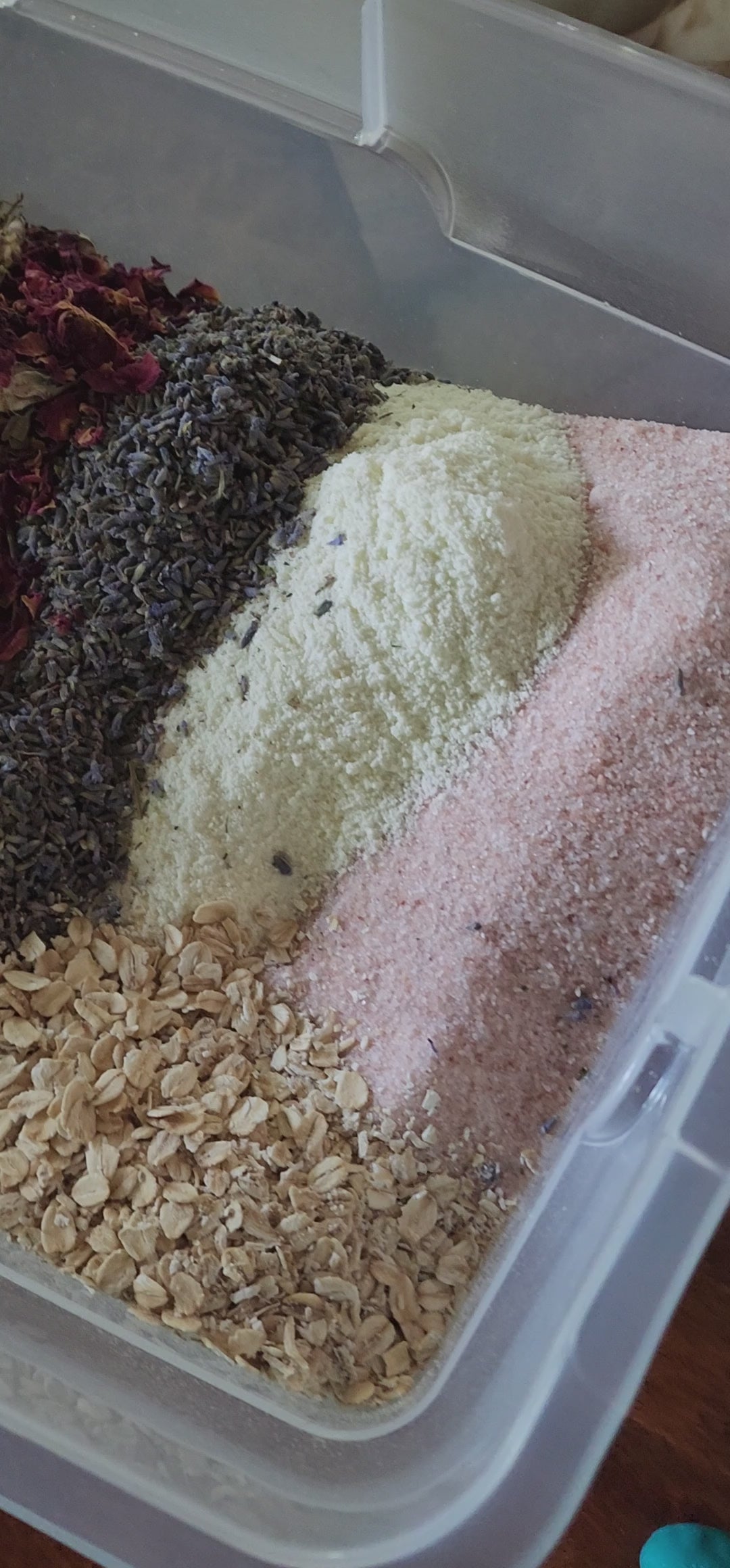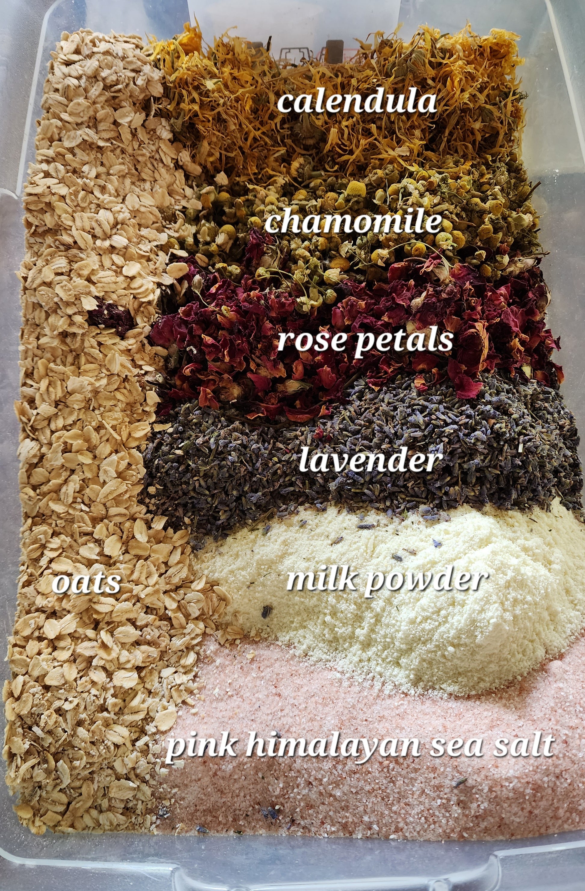 Epsom salt, pink himalayan sea salt, oats, milk powder, honey powder, coconut oil, shea butter, sunflower seed oil, almond oil, essential oils of rose, lavender, chamomile, eucalyptus, spearmint, dried rose petals, lavender buds, Calendula, and chamomile flowers.