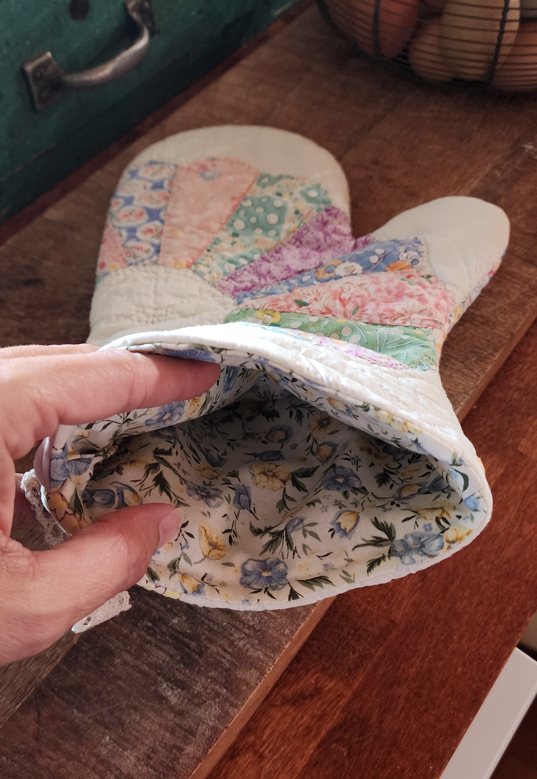 ***Because oven mitt is made with a vintage quilt, there ARE light stains and worn areas on this oven mitt. I believe this adds vintage charm, but please view photos carefully!***