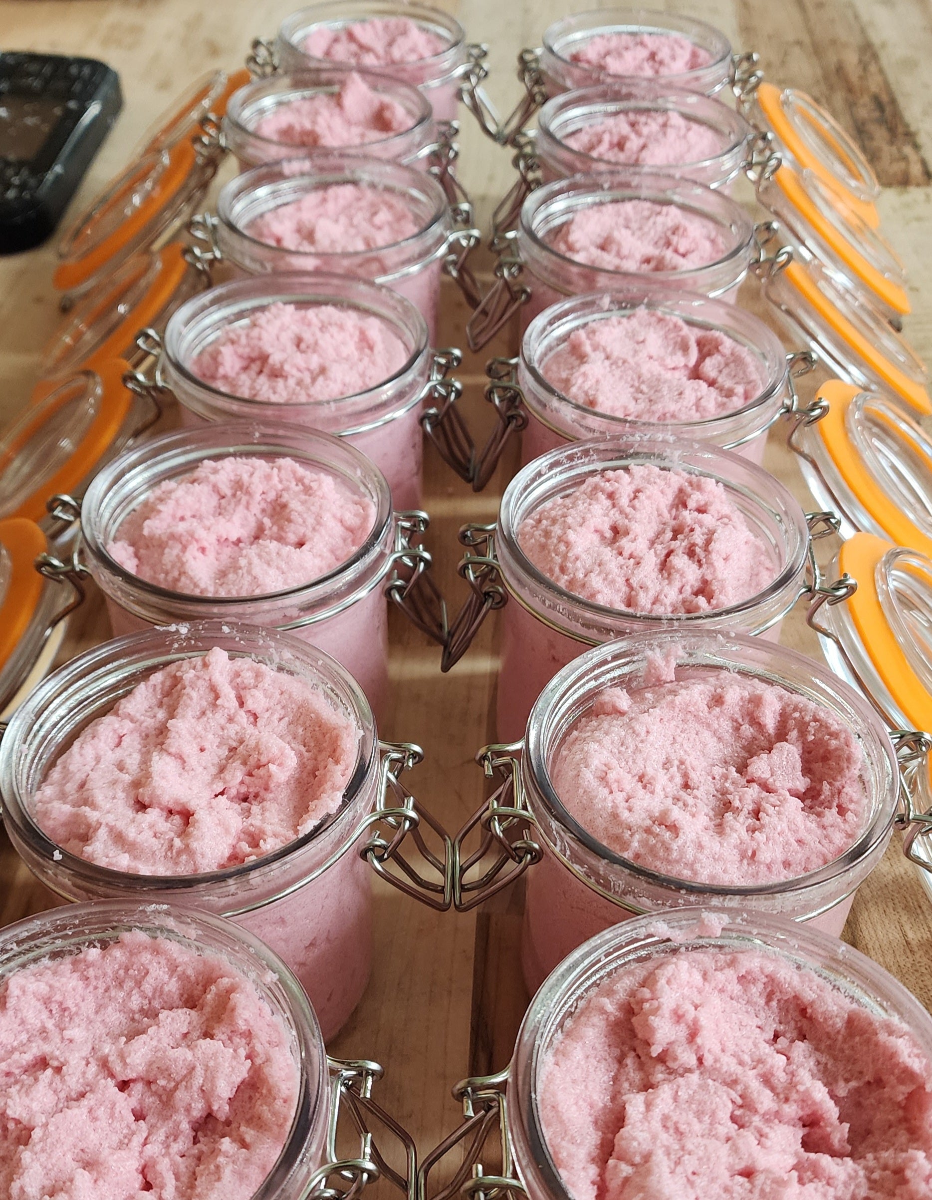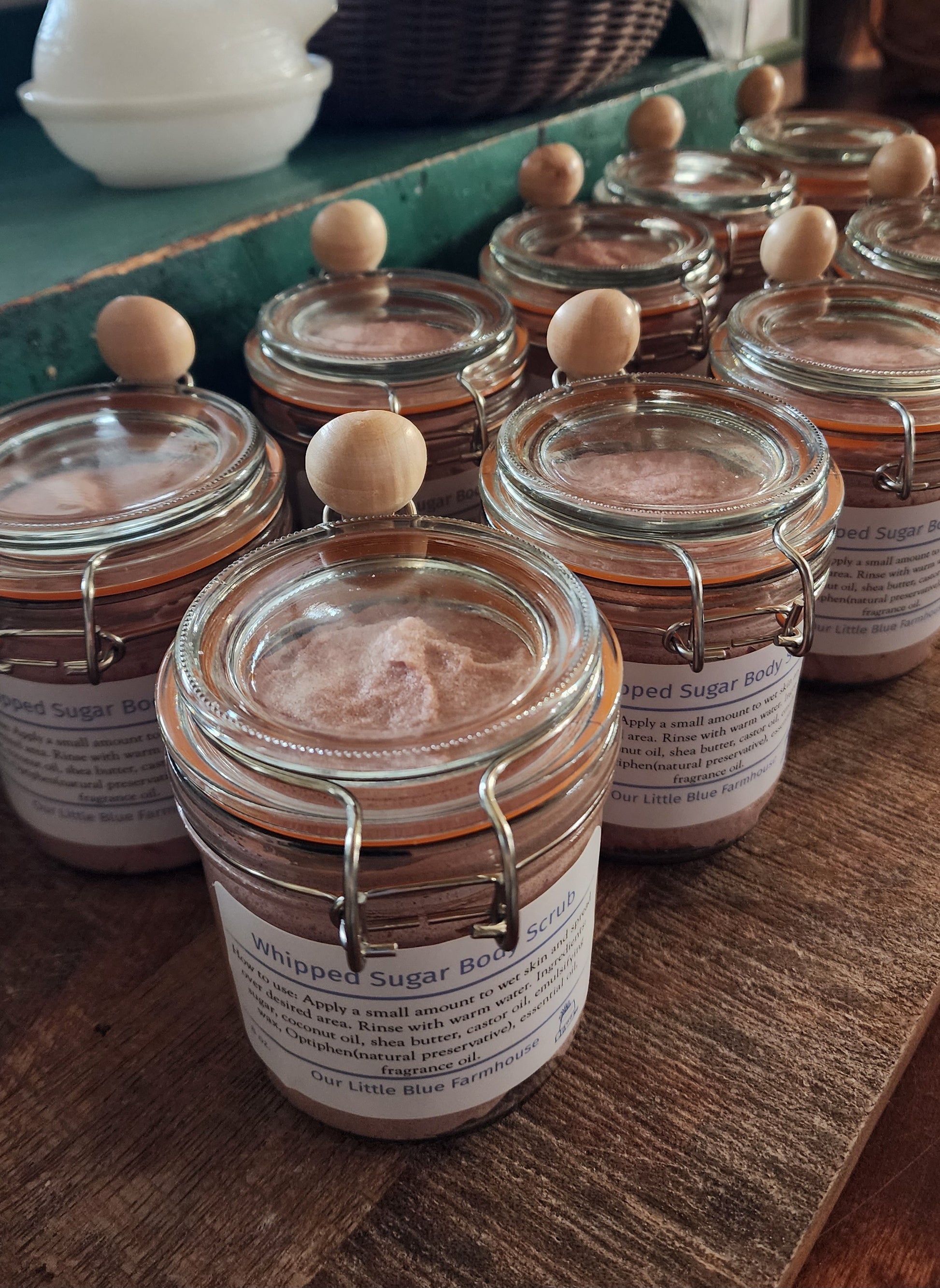 Sugar Scrub Ingredients: Cane sugar, coconut oil, shea butter, castor oil, emulsifying wax, Optiphen(natural preservative), essential oil, fragrance oil, mica powder.